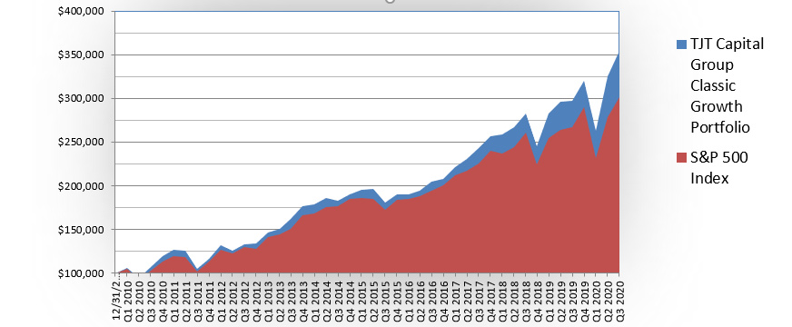 Disclosure: This is for informational purposes only and is not a recommendation or offer of any particular security or investment product. Advisory services are only provided to investors who become TJT Capital Group clients pursuant to a written agreement, which investors are urged to read and carefully consider before becoming a client. Past performance is no guarantee of future results. Past performance may reflect the performance of assets for a finite period of time, or during a period of extreme market activity. All investments involve risk and may lose money and may not reflect actual future performance. Past performance may also reflect the reinvestment of dividends, and is net of applicable transaction fees, TJT Capital Group LLC’s investment management fee (if deducted directly from the account) and any other related expenses. Account information has been compiled solely by TJT Capital Group, LLC and has not been independently verified, and does not reflect the impact of taxes on non-qualified accounts. In preparing this information, TJT Capital Group, LLC has relied upon data and information provided by the account custodian. The investment objective selected for illustration purposes is the TJT Capital Group Classic Growth Portfolios, a collection of actual client accounts with a Growth objective that are almost entirely invested in equity ETFs or Funds. These accounts were all established between the inception of TJT Capital Group LLC and December 31, 2009. For illustration purposes, these portfolios are compared to the S&P 500 Index, an unmanaged index that you cannot invest directly into. The return provided for the S&P 500 does not reflect fees, expenses or sales charges. The investments shown herein are subject to more risk than those considered appropriate for more conservative investors. TJT Capital Group LLC feels that the comparison in the illustration is appropriate as the TJT Capital Group Classic Growth Portfolios invest almost entirely in equity securities. This illustration is not intended to be a representation of any past recommendations, nor does it suggest that any past recommendations would be profitable. Please contact us at 877-282-4609 for more information and further disclosure.